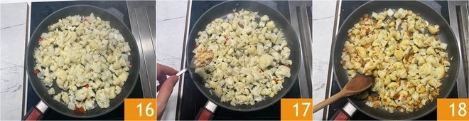 Cook for 5 minutes over medium-high heat 16. After this time, add the coarse breadcrumbs 17 and stir everything together 18; if needed, moisten with a little more water.