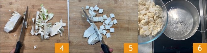 Take the stem and remove the outermost layer 4, then cut it in half lengthwise and slice it thinly 5; you should end up with about 24 oz (1.5 lb) of cleaned cauliflower. Immerse the cauliflower in salted boiling water 6.