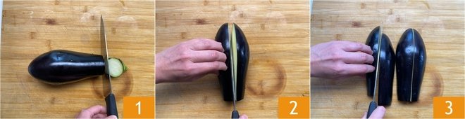 To prepare the sautéed eggplant, first wash the eggplants well and trim them 1. Then cut them in half lengthwise 2 and divide each half again 3.