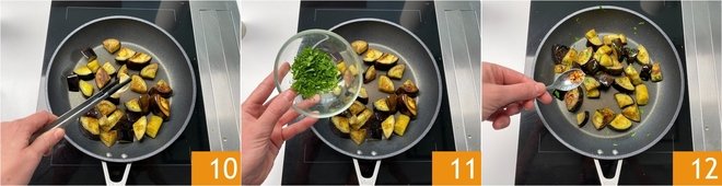 After about 15 minutes, the eggplants will be cooked, soft and well browned. Remove the garlic clove 10, season with chopped parsley 11 and dried chili pepper 12.