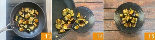 Toss the eggplants 13, transfer them to a serving dish 14 and serve 15.