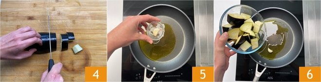 Now cut them into rather large cubes, about 3/4 inch 4. In a pan, pour a drizzle of oil and a garlic clove 5. Heat and then add the eggplants 6.