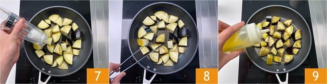 Salt 7 and cook over medium-high heat for a few minutes. Using tongs, turn the eggplant cubes 8; you'll notice that the oil has been completely absorbed by the eggplants, so add a bit more 9. At this point, the eggplants will be softer and you can toss them or turn them without using tongs.