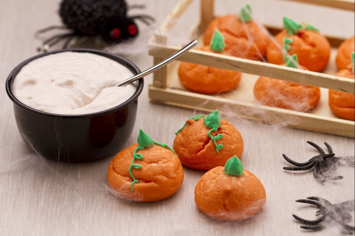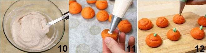 a pinch of salt, and 3 tbsp of milk; blitz everything until you get a smooth, but not liquid, mixture 10. Once the puffs have cooled, you can fill them. Put the filling in a pastry bag with a small plain piping tip, make a small hole in the lower part of each puff, and fill them with the ham and cheese cream 11. Lastly, make the pumpkin stem: Mix 4 tbsp of cream cheese with two drops of green food coloring (alternatively, blitz 4 tbsp of cream cheese with 1 tbsp of spinach that’s been boiled and wrung out well; once the ingredients are well combined, forming a thick green cream, strain it to get rid of any remaining spinach fibers). Put this mixture in a pastry bag with a small star piping tip and make small “stems” on the top of every Halloween pumpkin puff to give them a more authentic pumpkin look 12. Keep the savory Halloween pumpkin puffs in the fridge before eating them!