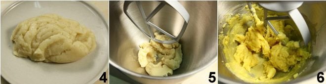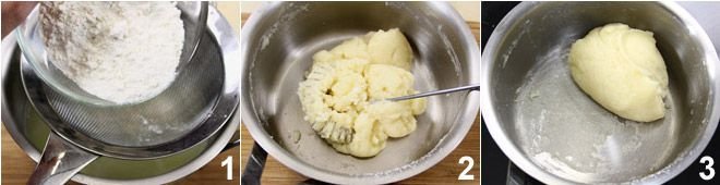 remove it from the heat and allow the dough to cool completely, placing it on a plate 4. Next, place the dough in the bowl of a stand mixer fitted with a flat beater (if you don’t have a stand mixer, you can also do everything by hand using a wooden spoon) 5, and add the eggs a little at a time and very slowly to the cold dough 6, stirring vigorously to incorporate them into the mixture.