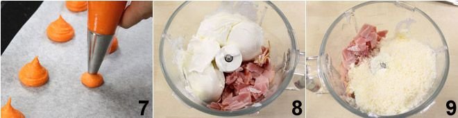 Finally, add the grated Parmigiano Reggiano cheese and the food coloring drops (4 yellow and 1 red) to get a nice bright orange color. At this point, put the dough in a pastry bag with a plain tip and place little round dollops of pastry dough on a baking sheet lined with parchment paper 7. Bake the puffs for 15 minutes at 430°F (220°C) in a conventional oven, avoiding opening the oven while they are baking. After the first 15 minutes, lower the temperature to 375°F (190°C) and bake the choux pastries for another 10 minutes, after which you can turn off the oven and leave the puffs inside for another 10-15 minutes with the door open slightly. While the puffs are cooking, you can turn to making the filling: In the bowl of a food processor, add the ham and fresh cheese 8, the grated Parmigiano Reggiano 9,