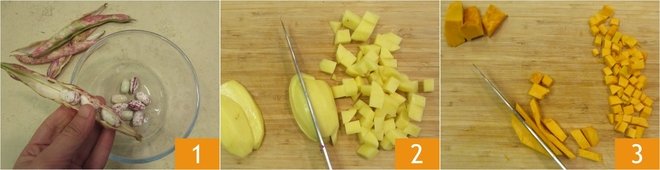 To make savory bread and vegetable cake, start by preparing the ingredients: shuck the fresh beans 1, then peel and dice the potatoes 2. Clean and dice the pumpkin too 3. You'll need around 5.3 oz of shucked beans and 5.6 oz of pumpkin pulp.