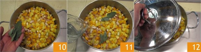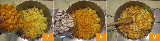 Add the pumpkin 7, the potatoes 8 and stir for 3-4 minutes on a medium flame 9.