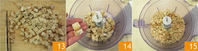 In the meantime, dice the old bread 13, place it in a mixer 14 and blend into crumbs 15.