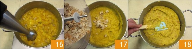 Once the vegetables are cooked, remove from the heat and blend with an immersion mixer 16. Add the bread crumbs to the hot mixed vegetables 17 and stir together 18.