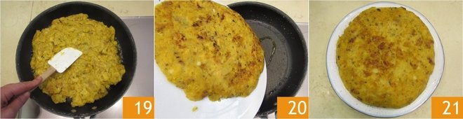 Now heat a drizzle of oil in a pan, add the mixture and press down to smooth the surface 19. Cook for a few minutes on a low flame, just enough time to form a crust, then delicately turn the fritter over using a plate, and slide it back into the pan 20; be careful as the consistency is rather soft. Cook for a few minutes on the other side too, after which you savory bread and vegetable cake is ready to be served while still nice and hot 21!