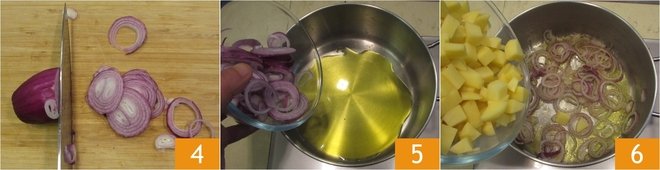 Lastly, peel and thinly slice the onion 4. Place the onion in a pan with a drizzle of hot oil 5, then add the potatoes 6.