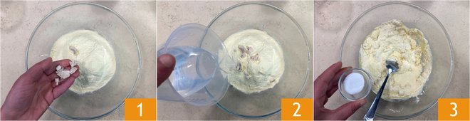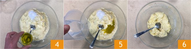 Also pour in the oil 4 and the remaining water. Be careful: the amount of water may vary depending on the type of flour used, so adjust based on the consistency of the mixture 5. Mix again with the spoon until the liquid is completely absorbed 6. Cover the bowl with a cloth and let it rest for 10 minutes, preferably in the oven turned off with the light on.
