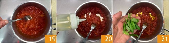 Cook over moderate heat for about 15-20 minutes, mashing the tomato pieces with a fork 19. When the sauce has thickened, turn off the heat and season with a drizzle of olive oil 20, then add the basil leaves 21 and set aside.