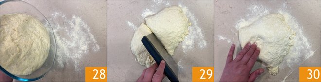 After the rising time, turn the dough onto a work surface dusted with semolina 28, then divide it in half with a dough scraper 29. Gently flatten the first part of the dough with your hands 30.