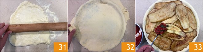 Roll it out with the rolling pin to a thickness of about 0.2 inches 31, then sprinkle the surface with a little semolina and transfer it to a 13 1/2-inch diameter baking pan, lightly greased with oil. Gently stretch the dough to cover the edges 32, then place the fried eggplants at the base and cover with the tomato sauce 33.