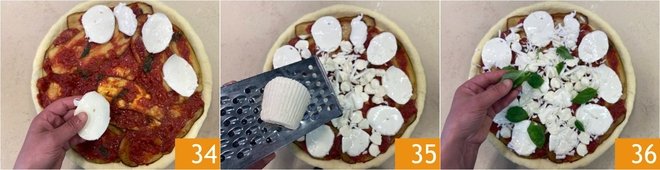 Add the mozzarella slices 34 and grate the salted ricotta 35, then finish with the basil leaves 36.