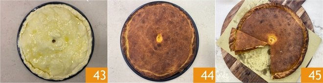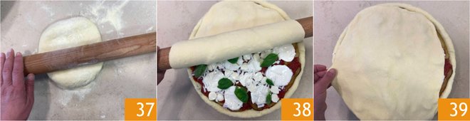 Now roll out the second portion of dough, also to a thickness of about 0.2 inches 37. Sprinkle the dough with a little semolina, roll it onto the rolling pin, and lay it over the pan to cover the filling 38. Match the edges by gently stretching them 39 and press with your fingertips to adhere.