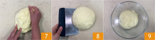 After this time, transfer the mixture to the work surface and work it vigorously with your hands for about ten minutes, without adding flour 7. If you have a lot of difficulty working the dough, let it rest again for another ten minutes. When the dough is no longer sticky but smooth and homogeneous, shape it into a ball with the help of a dough scraper 8 and put it back in the bowl. Cover with plastic wrap and let it rise for about 2 hours, always in the oven turned off with the light on. The rising time is indicative; the dough should double in volume 9.