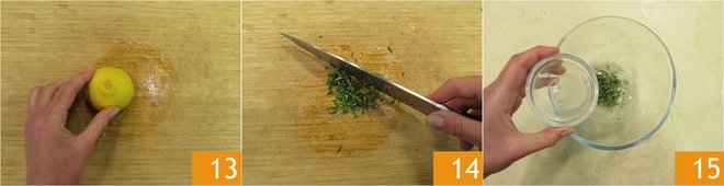 Prepare the salmoriglio. To prevent the rosemary from darkening, moisten the cutting board with lemon juice 13, then finely chop the needles 14 and transfer to a bowl. Also, add 1/2 teaspoon of lemon juice 15.