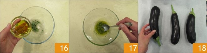 Add the extra virgin oil 16, salt, and water. Mix to create an emulsion and set aside 17. Wash the long eggplants, dry them, and place them on a baking tray 18. Bake in a preheated static oven at 350°F for 35 minutes, then turn off the oven and leave them inside for another 25 minutes. This will make the skin tender.