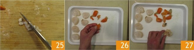 Finally, cut the muscles into pieces 25. Place a couple of tablespoons of the marinade in a tray and place all the scallop parts on top 26 27.