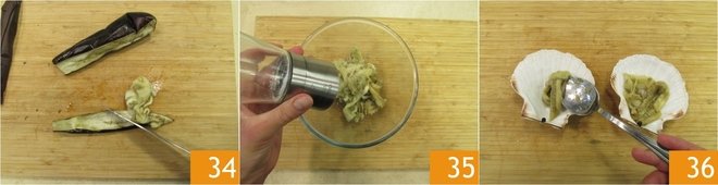 Scoop out the pulp without breaking the skin 34, chop it, and transfer it to a bowl. Season with the freshly made salmoriglio and a pinch of salt 35. Take the skin and cut it into diamond shapes. Take the cleaned shells and divide the eggplants inside. Slightly press them with the back of a spoon 36.