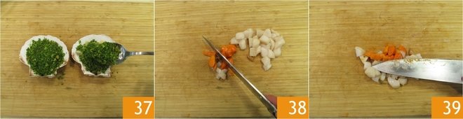 Place the first breading on top 37 and bake in a preheated static oven at 375°F for 7 minutes. Take the scallops and cut the meat into cubes 38. Mix with the pieces of muscle and roe 39.