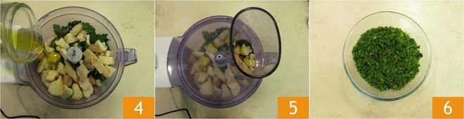 Now prepare the flavored oil. Heat the sunflower oil in a small pot and add the parsley stems 7. Let it infuse for a few minutes, then let it cool. Blend everything with a mixer 8, then strain using gauze or a kitchen cloth 9. Set aside.