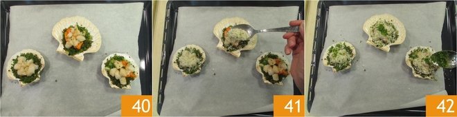 Remove the shells with the eggplants from the oven and place the scallop cubes on top 40. Cover with the second breading, the one with the panko 41, and add a bit more of the previous breading 42.