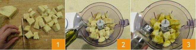 To prepare scallops au gratin, start by making the breadcrumb coating: remove the crust from bread (which you can then use to make croûtons); dice the soft part into small pieces 1. Place in a mixer, add the oil 2, salt and pepper to taste 3.