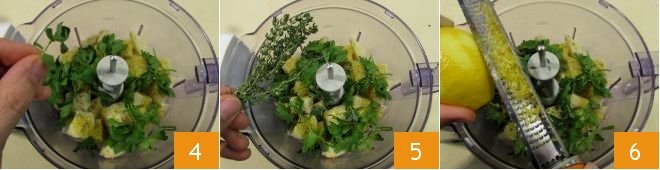 Add the aromatic herbs, parsley, marjoram, thyme (4-5) and lastly, the grated zest of a lemon 6.