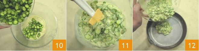 Now pour the zucchinis into the bowl 10 and mix to incorporate them into the batter 11. Pour the batter into a greased and floured 9-inch round pan 12, using a spatula to help.