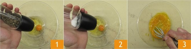 To prepare scrambled eggs, first break the eggs into a bowl, pepper 1 and salt to taste 2, then beat with a hand whisk: the mixture of yolks and whites should not be completely homogeneous 3.