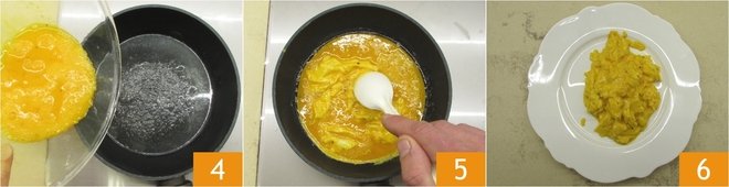 Heat the oil in a pan and pour the beaten eggs inside 4. Cook over low heat and, when the eggs start to set, stir with a spatula so as to break them up and achieve the scrambled effect 5. The eggs should be quite soft, not dry: it will take a couple of minutes. At this point, remove the pan from the heat and serve your scrambled eggs 6!