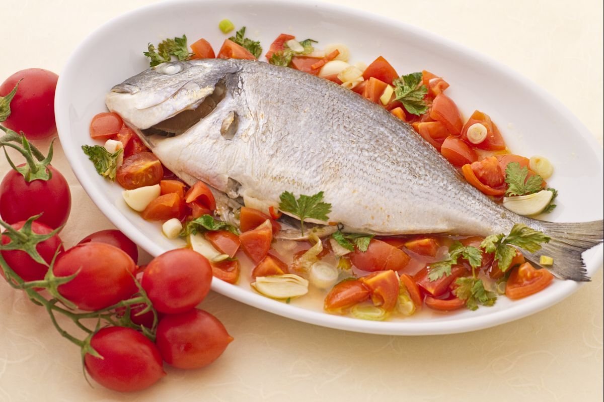 Then rinse the sea bream under cold running water, making sure it is also clean inside 7. Place a pinch of salt, a clove of garlic, and a couple of parsley leaves inside the belly. Take a baking dish (or a baking tray), sprinkle the bottom with extra virgin olive oil, then lay the sea bream (or the sea bream if you chose the 1.75 lbs one). Cut the cherry tomatoes into wedges or cubes and add them to the baking dish along with the remaining two sliced garlic cloves, parsley leaves 8, salt, and pepper (or fresh chili if you like), water, and white wine 9; the liquids should not cover the sea bream entirely but should remain below half the height of the fish. Bake in a preheated oven at 430°F for about 20-25 minutes: to make sure the fish is cooked, try to pull out the caudal fin: if it comes off easily, the sea bream is cooked; otherwise, if it resists, cook the fish for a few more minutes.