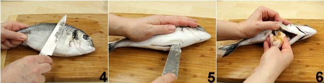 Scale the sea bream 4, make a cut on the belly 5 and gut the sea bream 6.