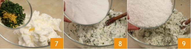 Gently mix in the herbs 7. Stir, add the fine and coarse salt 8 a little at a time 9, and mix everything together.