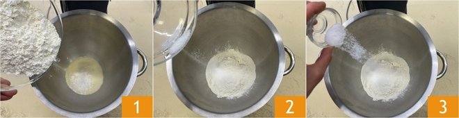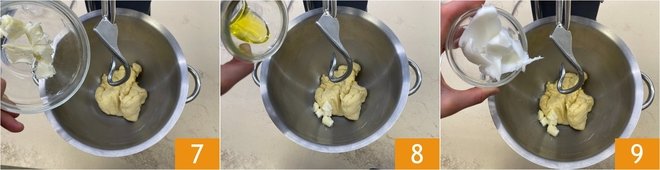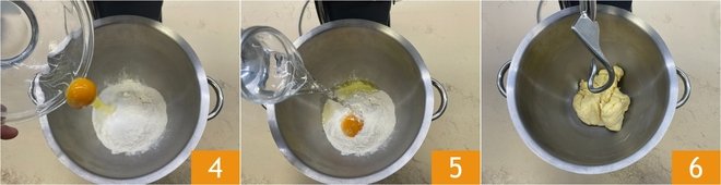 Also add the egg 4 and the water 5. Start kneading at low speed until you get a homogeneous and uniform mixture 6. It will take about 15 minutes.
