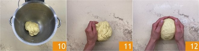 Knead for another 5 minutes 10, then transfer to a work surface and knead with your hands 11. Form a ball 12.