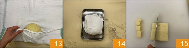 Wrap it in a towel 13 and let it rest for 24 hours in the refrigerator 14. The next day, take the cheese you had left out of the fridge for 24 hours and cut it into cubes 15.