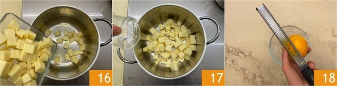 Place it in a saucepan over very low heat 16 and add a splash of water 17. Let it melt and in the meantime grate the orange zest 18.