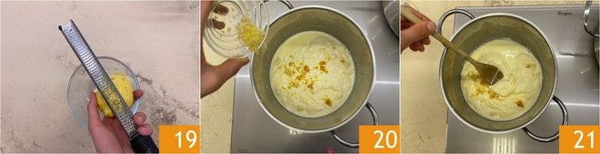 Also, grate the lemon zest 19. Stir occasionally with a wooden spoon, and when it is almost completely melted, add the lemon and orange zest 20. Stir again to let the flavors mix well 21.