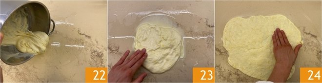 When the cheese is very stringy, transfer it to a surface moistened with water 22. Wet your hands well and gently press the cheese 23 until you get a thickness of about 1/4 inch 24.