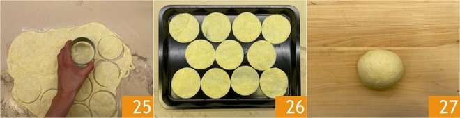 Let the cheese solidify for a few minutes, then use a 8-inch cookie cutter to cut out disks 25 and place them on a baking sheet 26. The scraps can be remelted as done previously and used to make other disks. You can store the disks in the fridge until ready to use.