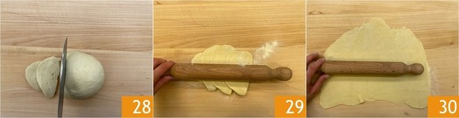 Take the dough and cut it into slices with a knife 28. Place some next to each other, sprinkle with semolina 29, and roll out the dough with a rolling pin until it is about 1/25 inch thick 30. You can fold the dough over itself to get a more uniform result.