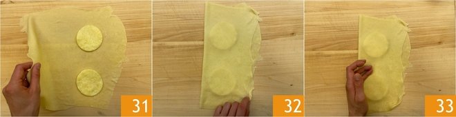 Place a couple of cheese disks on the dough 31, depending on the length of the dough. Then fold the dough to fully cover the disks 32 and press lightly around the cheese with your hand to let the air out 33.
