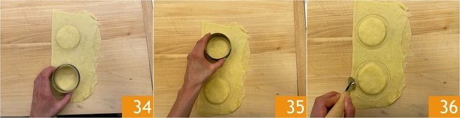 Take a 4-inch cookie cutter and gently press it with the smaller part to give it some shape without cutting it 34, then flip it and mark the shape using the larger part 35. Finally, cut the circumference using a cutter wheel 36.
