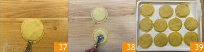 Seal the edge with the cutter wheel or with the prongs of a fork 37. If you prefer, decorate the center as well 38. Continue this way until all are formed 39.