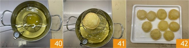Heat plenty of vegetable oil to 265-285°F at most and immerse 1 seadas at a time so as not to lower the oil temperature too much. Cook it using a spoon to baste it with the hot oil. When it is well puffed and golden, drain it 41. Continue this way, draining the seadas on a tray lined with paper towels 42.